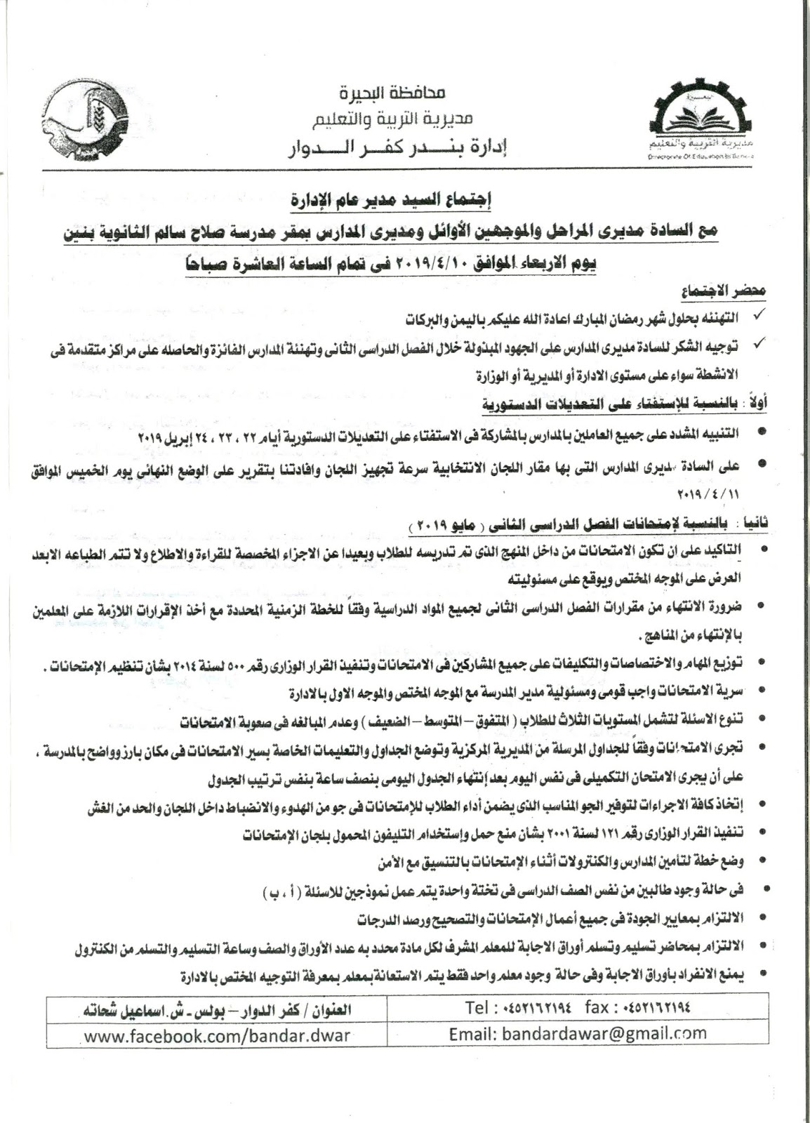 إدارة التعليم الإعدادي محضر اجتماع مدير عام الإدارة يوم الاربعاء الموافق 10 4 2019م