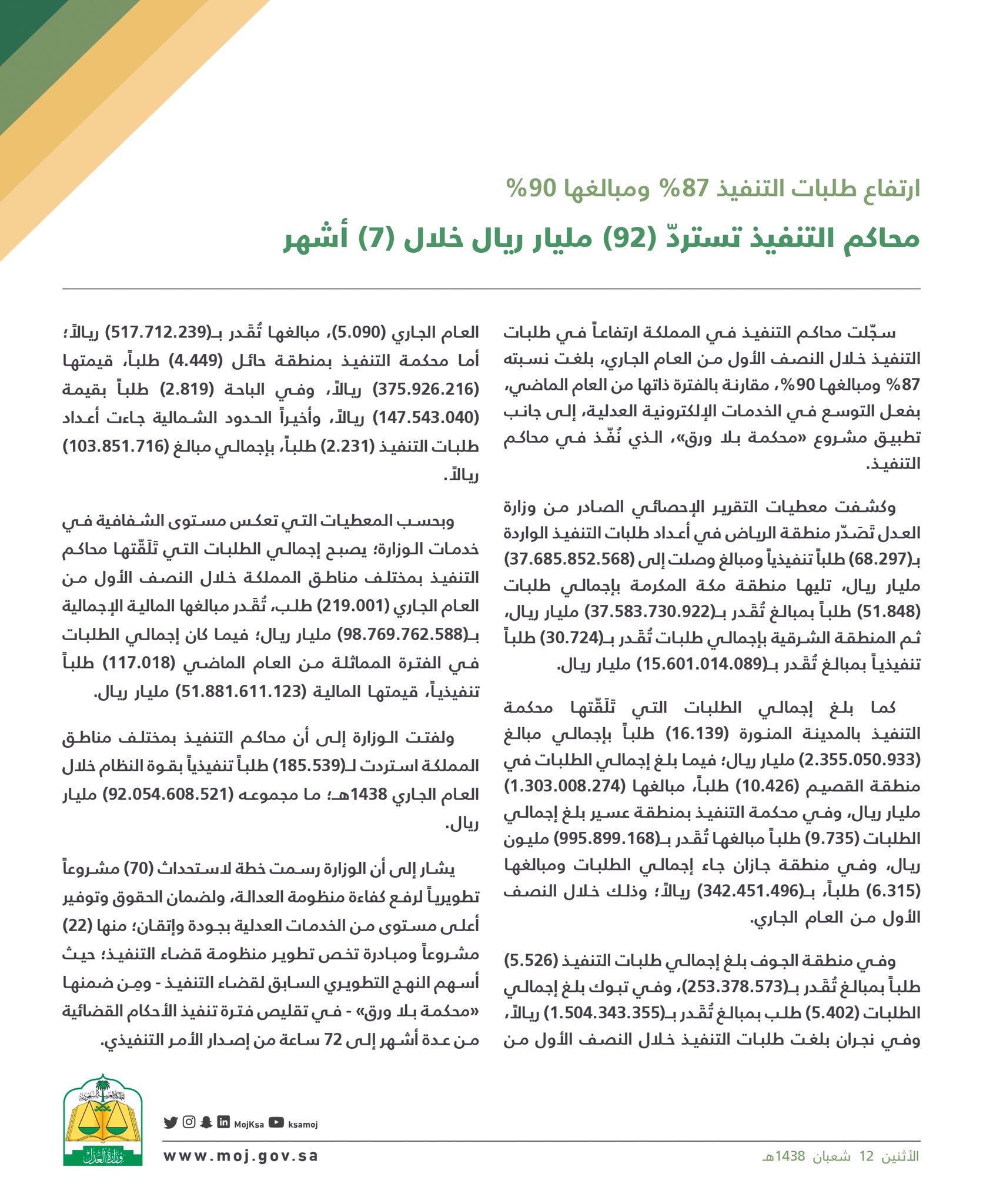 وزارة العدل على تويتر محاكم التنفيذ في المملكة تسترد 92 مليار ريال خلال 7 أشهر