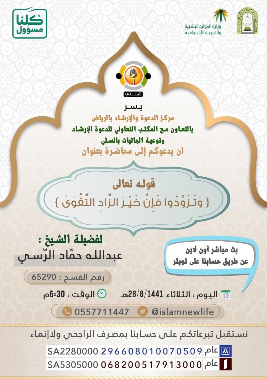 في ظ لال آية لله A Twitter محاضرة عن بعد وتزودوا فإن خير الزاد التقوى الشيخ عبدالله بن حماد الرسي الثلاثاء ٢٨ ٨ الساعة ٦ ٣٠ مساءا البث Islamnewlife Https T Co Twmn3knxpf