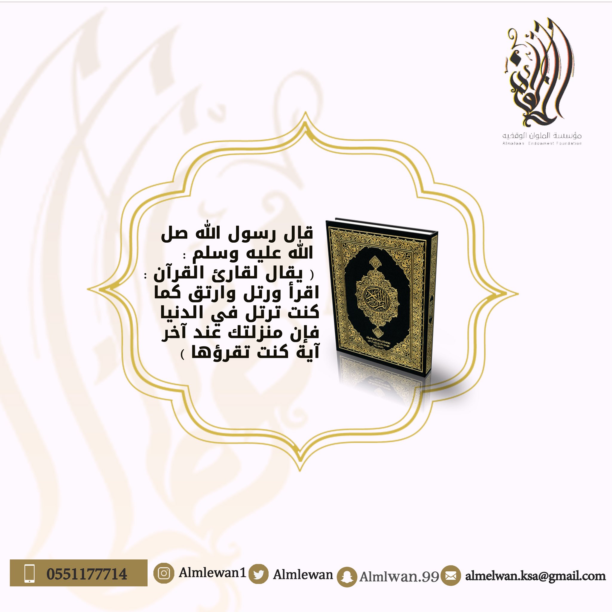 مؤسسة وقف الملوان الوقفية در توییتر قال رسول الله صل الله عليه وسلم يقال لقارئ القرآن اقرأ ورتل وارتق كما كنت ترتل في الدنيا فإن منزلتك عند آخر آية كنت تقرؤها مؤسسة وقف الملوان قرآن كريم